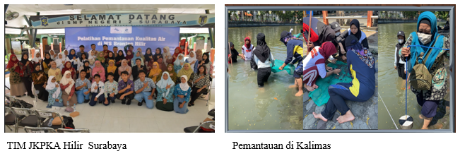 Pemantauan di wilayah Hilir dilakukan di dua tempat yaitu di Sungai Brantas Kesamben Jombang dan dua sungai di Surabaya yaitu sungai Kalimas dan Sungai Paneleh. Hasil pengukuruan dengan parameter fisik Di sungai Brantas Kesamben Jombang untuk suhu air rata (30-32)°C, air berwarna coklat, tingkat kekeruhannya 37,5. Untuk indikator kimia dengan  paper strip  pH terukur 6.5-7.5,  didapati juga kadungan besi 0,3 mg/L, Cl 5 mg/L Br2 , F2  dan ion nitrat masing -masing 10 mg/L. Bahan-bahan kimia masuk kategori melebihi ambang batas tersebut kemungkinan bersumber dari limbah industri atau domestik yang dibuang di Sungai. Dari parameter biologi masih didapati kijing, cacing, larva nyamuk dan udang Sungai. Rata-rata kualitas air diukur dengan indek IKA skornya 5 kategori kualitas air  sedang.
