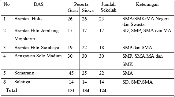 Kegiatan Regenerasi JKPKA 2025 dilaksanakan  mulai bulan Juli hingga Oktober 2025  di enam wilayah Daerah Aliran Sungai (DAS) di Jawa Timur dan Jawa Tengah. Kegiatan ini bertujuan membangun kepedulian siswa  terhadap lingkungan, melalui praktik pemantauan kualitas sungai dan penguatan peran sekolah sebagai agen konservasi. Sebanyak  124 sekolah yang berpartisasi, tersebar di enam wilayah sebagai berikut.